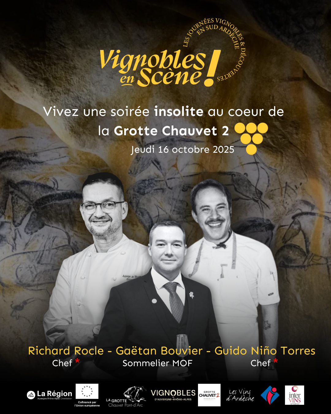 La soirée débute au belvédère, face au coucher de soleil, avec trois bouchées apéritives accompagnées de vins soigneusement sélectionnés par un sommelier Meilleur Ouvrier de France. Elle se poursuit au cœur de la grotte, face aux fresques préhistoriques, avec un menu gastronomique complet imaginé par nos deux chefs étoilés d’Ardèche : entrée raffinée, plat gastronomique et dessert gourmand, pour un véritable voyage culinaire.